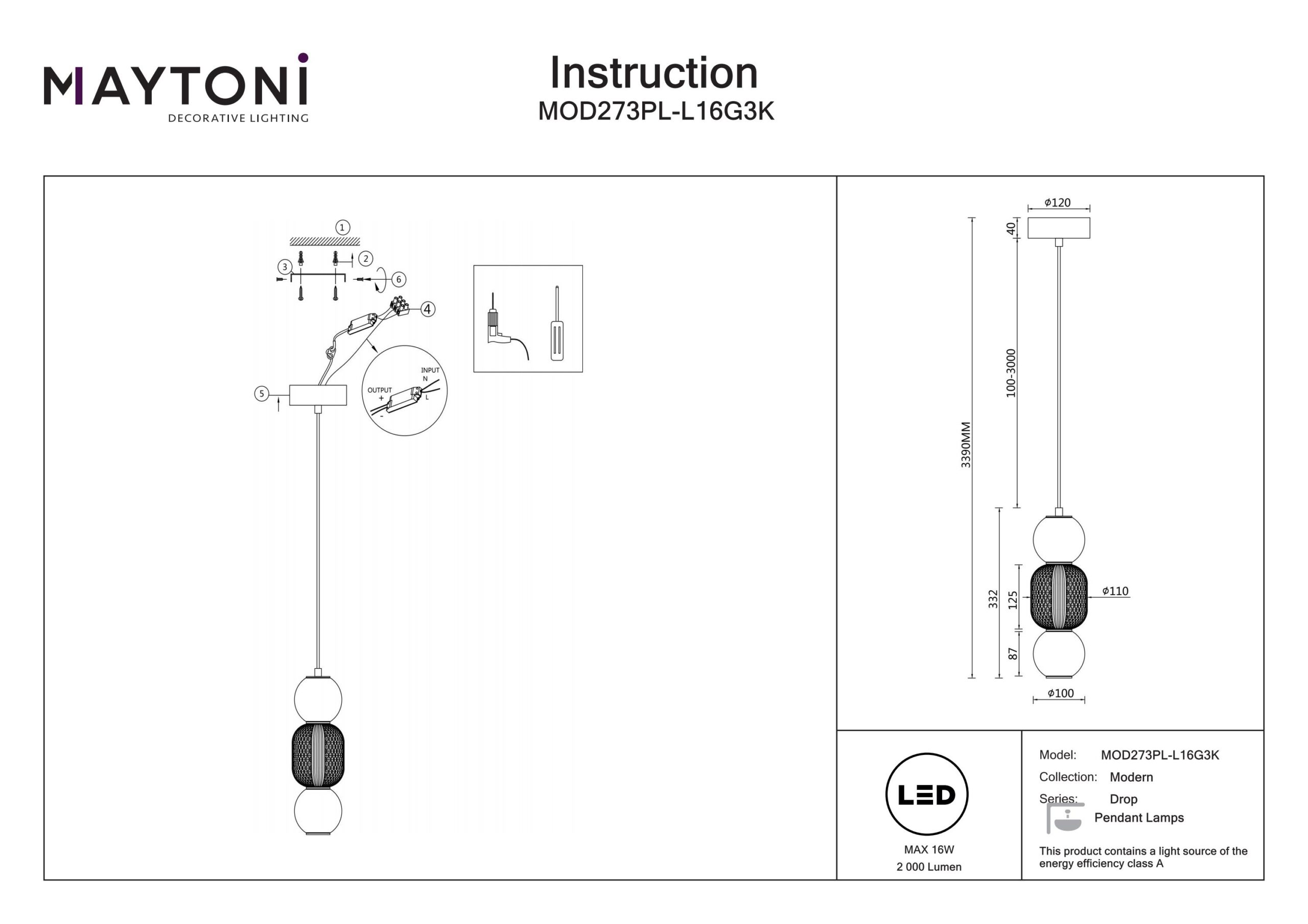 Ripplamp, LED Drop-MAY-MOD273PL-L16G3K, Maytoni, Saksamaa, LED 16W Diameter 12cm, Kõrgus 339cm, Värvustemperatuur 3000K, Valgusvoog 2000lm, Klaas, Metall, Kuld, IP 20, Max Kõrgus 339cm, Min Kõrgus 47,2cm