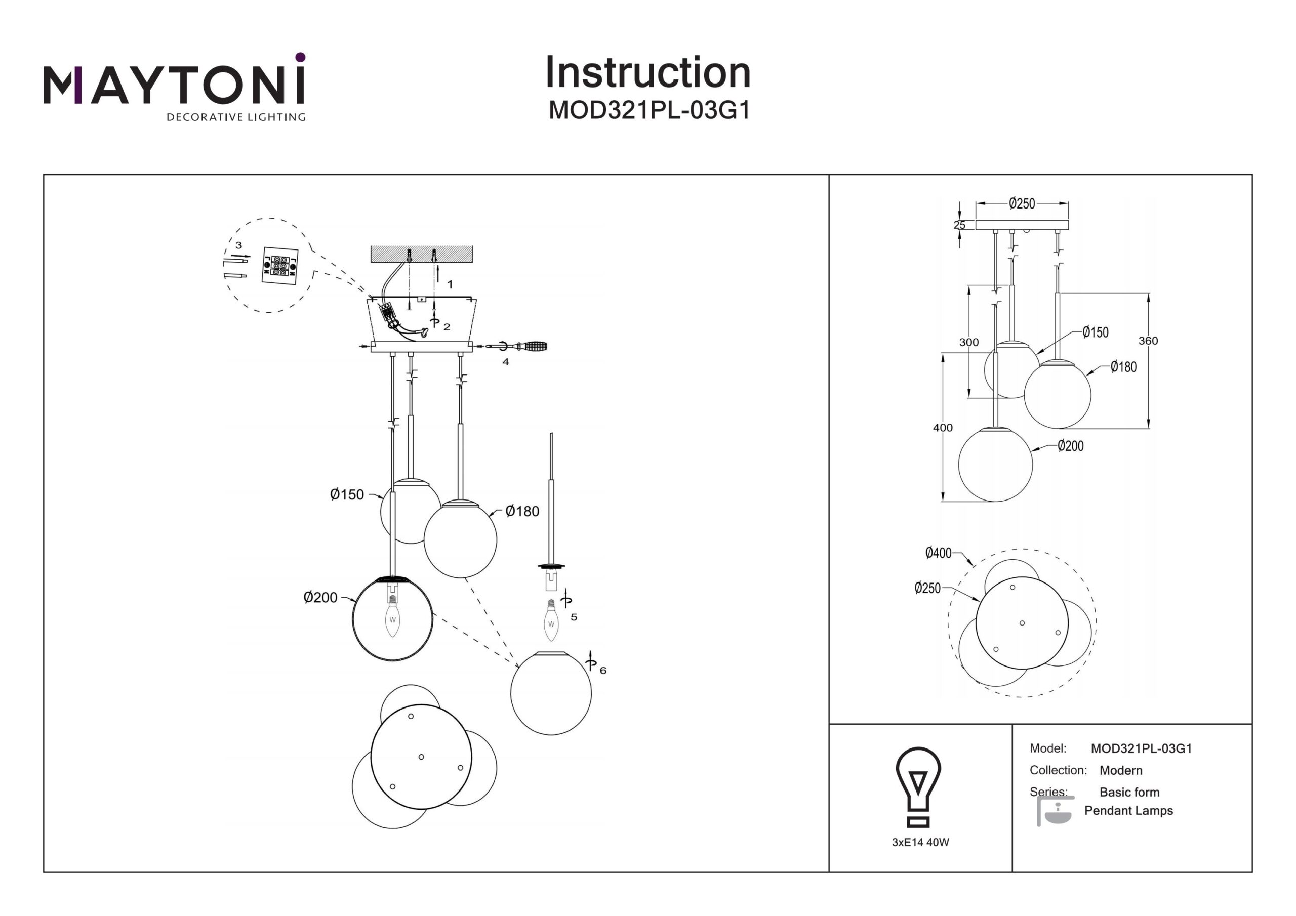 Ripplamp Basic form-MAY-MOD321PL-03G1, Maytoni, Saksamaa, 3 pirni E14 40W komplekt ei sisalda pirni Diameter 40cm, Kõrgus 222,5cm, 25, Klaas, Metall, Kuld, IP 20, Max Kõrgus 222,5cm, Min Kõrgus 52,5cm