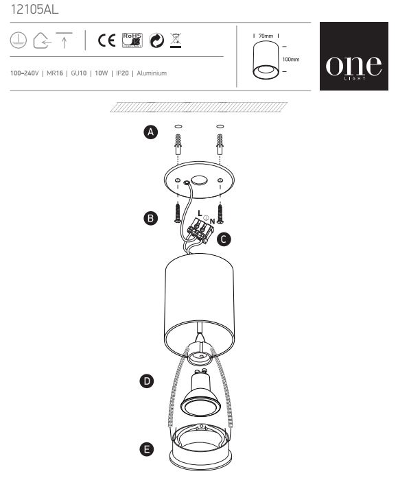Laevalgusti- 12105AL, ONE Light. Spot. Must, must ja kuld, valge ja kuld värv. 1* GU10, 10W; IP20. Vastab standardile EN60598-1 ja muudele spetsiifilistele standarditele. Kuju: ümmargune; Kõrgus 100 mm; Läbimõõt 70 mm; Materjal – Alumiinium; Garantii 5 aastat.