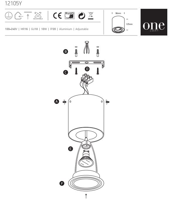 Laevalgusti- 12105Y, ONE Light. Must või valge värv. 1* GU10, 10W; IP20. Vastab standardile EN60598-1 ja muudele spetsiifilistele standarditele. Kuju: ümmargune; Kõrgus 125 mm; Läbimõõt 96 mm; Garantii 5 aastat.