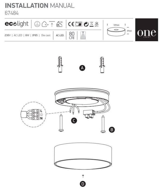 Laevalgusti, LED kohtvalgusti – 67484. ONE Light. 6W alumiiniumist LED-silinder, IP65 ideaalne vannituppa paigaldamiseks. Must või valge värv. Vastab standardile EN60598-1 ja muudele spetsiifilistele standarditele. Värvitemperatuur 3000K; Lumen väljund 480 lm. Kõrgus 37 mm; Läbimõõt 107 mm. Garantii 2 aastat.