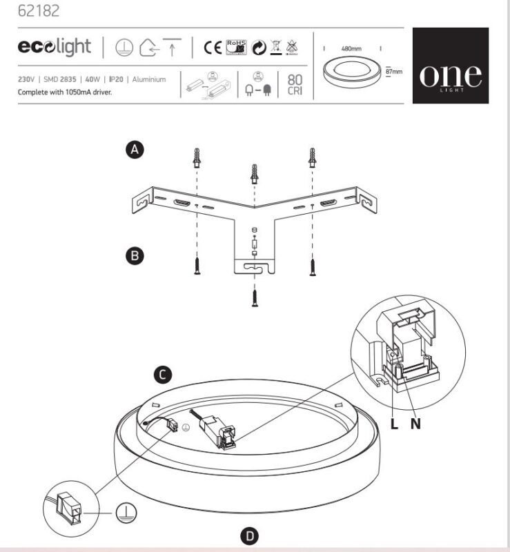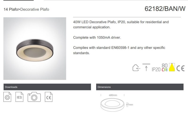 Led valgusti, LED laevalgusti, LED laelamp 62182 ONE Light. Korpuse värvid: matt kuldne, matt must, matt pruun. 40W LED dekoratiivne laelamp, IP20, sobib elu- ja äriruumidesse. Värvitemperatuur 3000K; Lumen Väljund 3400lm; Valgusefektiivsus 85lm/W. Kõrgus 87 mm; Läbimõõt 480 mm.