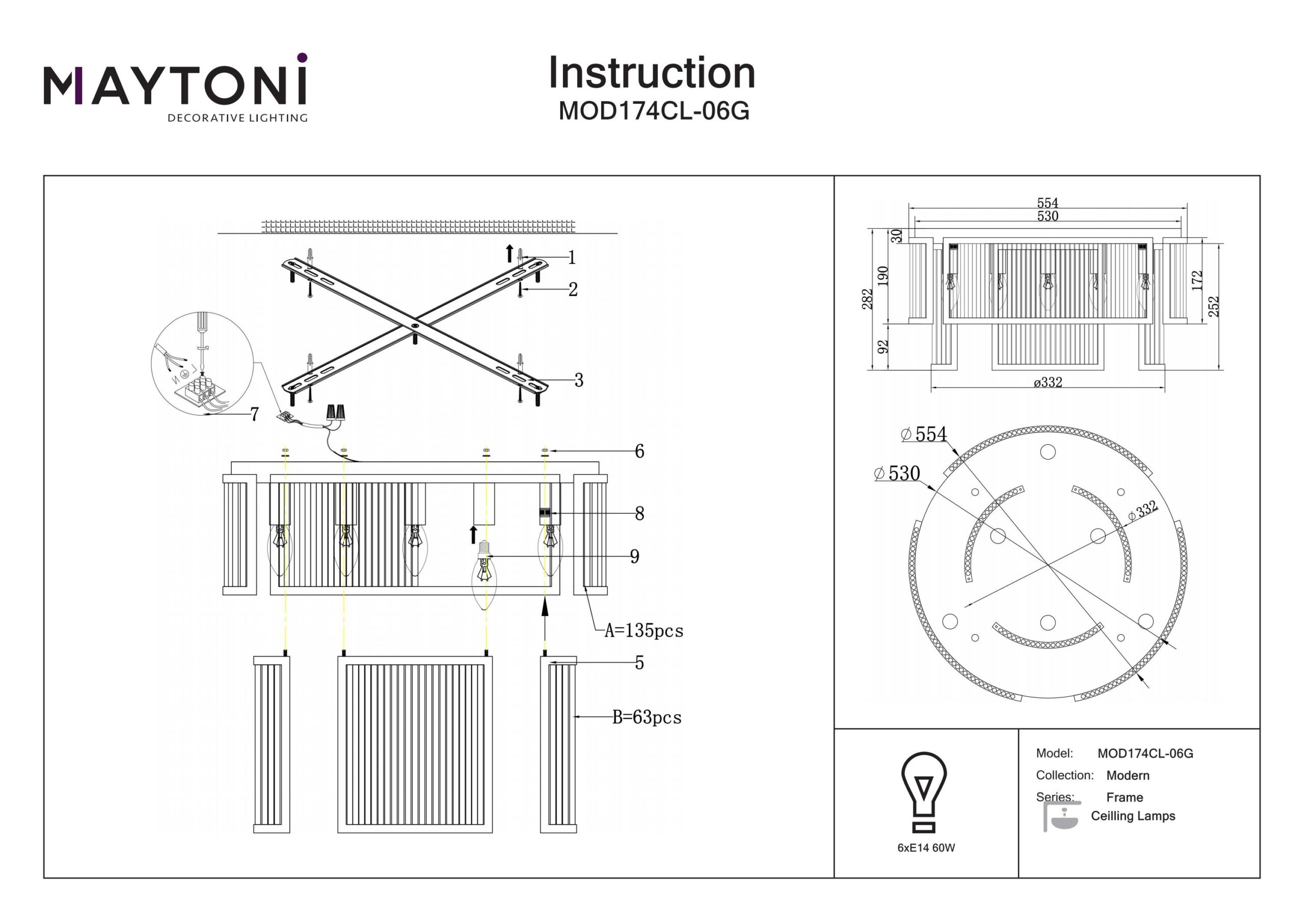 Laelamp Frame-MAY-MOD174CL-06G, Maytoni, Saksamaa, 6 pirni E14 60W komplekt ei sisalda pirni Diameter 55,4cm, Kõrgus 28,2cm, -, Klaas, Metall, Kuld, IP 20
