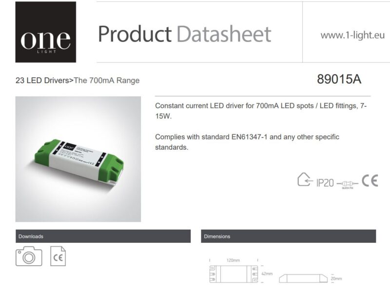 Led-Driver ONE Light-89015A. Pideva vooluga LED-draiver 700mA LED-täppide / LED-liitmike jaoks, 7-15W. Vastab standardile EN61347-1 ja muudele spetsiifilistele standarditele. Garantii 5 aastat Keskmine eluiga 50 000 tundi.