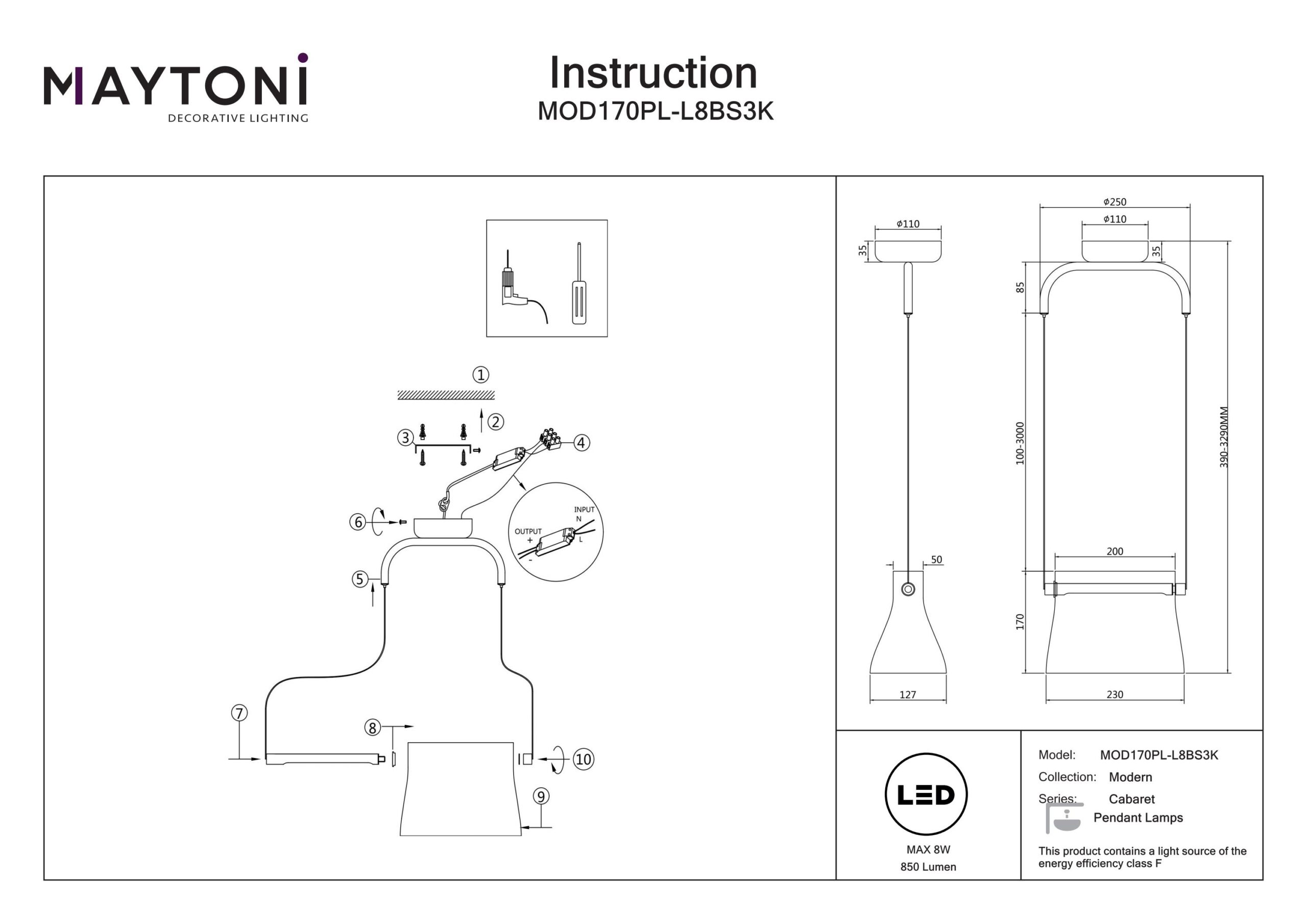 Ripplamp, LED Cabaret-MAY-MOD170PL-L8BS3K, Maytoni, Saksamaa, LED 8W, Kõrgus 329cm, Värvustemperatuur 3000K, Valgusvoog 850lm, Klaas, Metall, Messing, IP 20, Laius 12,7cm, Sügavus 25cm, Max Kõrgus 329cm, Min Kõrgus 39cm