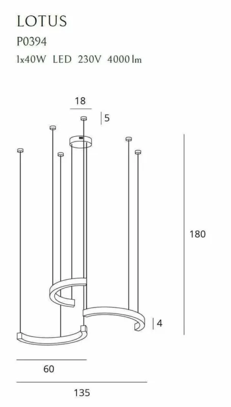 Rippvalgusti Max-Lotus-P0394D. Lotuse perekonna põhikuju on läikiv kuldne kaar, mille põhja on sisseehitatud valgusallikas. Lambi vorm toob silme ette elegantsete, kuid ilmekate ehete komplekti. Perekond koosneb kahest mudelist: ühekaarelisest seinavalgustist ja rippvalgustist, milles kolm kaarekuju annavad suurepärased võimalused igasuguseks paigutuseks. 1*40W LED 4000lm, 3000K, Pikkus 180 cm, Laius 135 cm