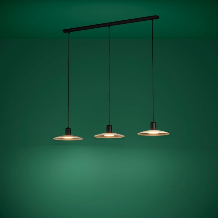 Rippvalgusti MAYAZES-EG-39912, 3 pirni GU10-LED 4,6W, komplekt ei sisalda pirni, Metall, Puit, Must, Loomulik, Kõrgus 150 cm, Pikkus 105 cm, Laius 25 cm; IP20