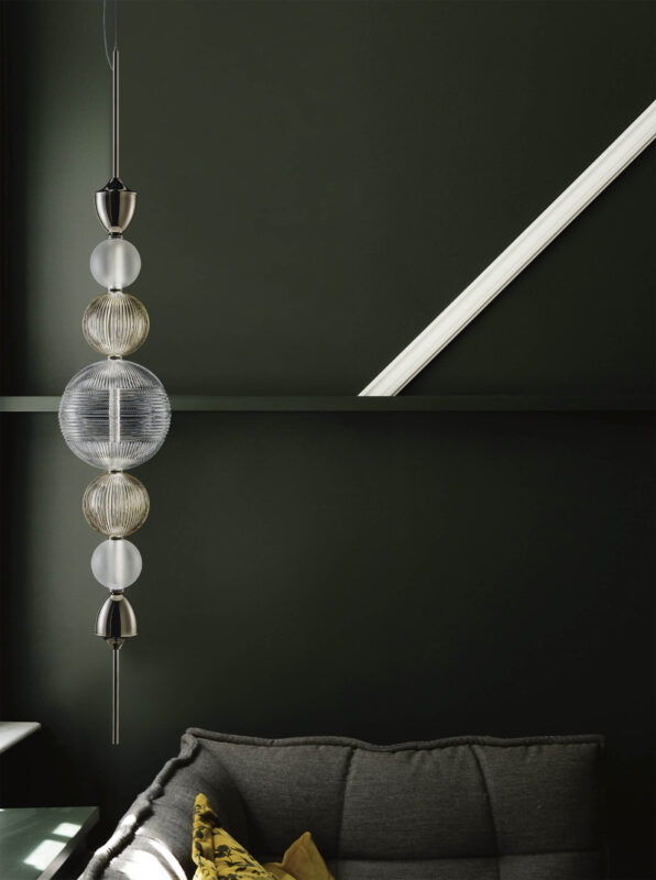 Ripplamp-Greta-ITL-081610S0. Helekuldse või nikkelkuldse viimistlusega metallraamiga ripplamp ja käsitsi lõigatud puhutud kristallist hajuti.
