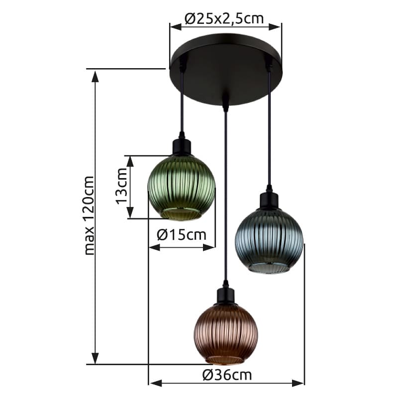 Ripplamp ZUMBA-GL-15638-3, GLOBO, Austria, 3 pirni E27 25W, Diameeter 36 cm, Kõrgus 120 cm, IP20, Metall, Klaas, Must, Mitmevärviline