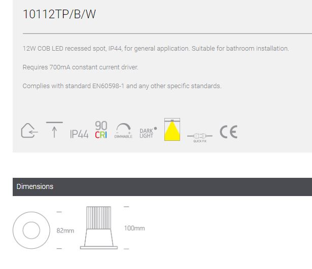 LED Spot valgusti – 10112TP. ONE Light. Värvitemperatuur 2700K / 3000K / 4000K. Must või valge värv. 12W COB LED süvistatav koht, IP44, üldiseks kasutamiseks. Sobib vannitoa paigaldamiseks. Vajab 700mA konstantse voolu draiverit. Kuju: ümmargune; Kõrgus 100 mm; Läbimõõt 82mm; Väljalõike augu läbimõõt 75mm; süvistatav lagi – jah; Nõutav sügavus 110 mm. Sisendtüüp – konstantne vool; Sisendvool 700mA; Võimsus (vatti) 12W; IP reiting IP44; Valgusallikas – sisseehitatud LED; LED tüüp – COB; Kaabli pikkus 40cm; Kiire pistik – One Light 700