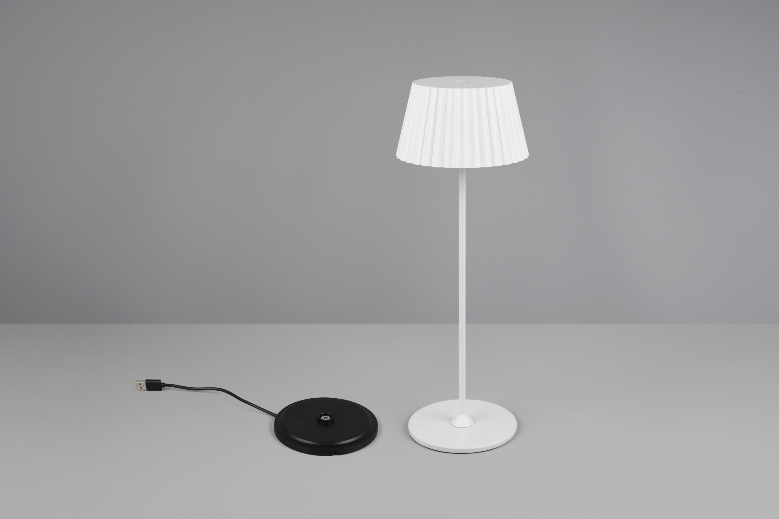 Laualamp SUAREZ-TRL- R57706131, 1x SMD, 1,5W · 1x 200lm, 3000K, Metall, Matt valge, Kõrgus 39 cm, Diameeter 13 cm, IP44, Anduri dimmer, USB ühendus, Töötab laetava akuga, Trio, Tarneaeg kuni 21 päeva