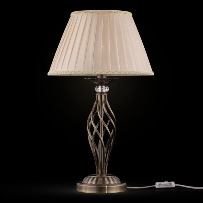 Настольная лампа. Настольная лампа из коллекции Grace. 1 х E14, макс. 40 Вт. Высота 55 см. Диаметр абажура 32 см. Потолочные светильники, украшенные подвесками из хрусталя, нежного цвета состаренной бронзы образуют элегантный, живой образ серии осветительных приборов. Абажур торшера изготовлен из органзы. Благодаря необычному спиралевидному основанию вся конструкция настольной лампы кажется движущейся.