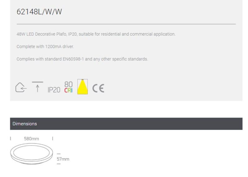 Led valgusti, LED laevalgusti, LED laelamp 62148L ONE Light. Korpuse värvid: valge, must, matt kuldne, matt pronks. 48W LED dekoratiivne laelamp, IP20, sobib elu- ja äriruumidesse. Värvitemperatuur 3000K; Lumen Väljund 4080lm; Valgusefektiivsus 85lm/W. Kõrgus 57 mm; Läbimõõt 580 mm.
