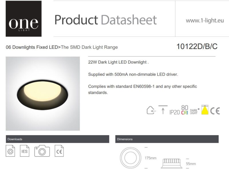 LED kohtvalgusti – 10122D. ONE Light. Must või valge värv. Värvitemperatuur 3000K. 22W LED süvistatavad kohtvalgusti, IP20, üldiseks kasutamiseks. 22W tume valgusega LED-allvalgusti. Kaasas 500mA mittehämardatav LED-draiver. Vastab standardile EN60598-1 ja muudele spetsiifilistele standarditele. Kuju: ümmargune; Kõrgus 55 mm; Läbimõõt 175 mm; süvistatav lagi – jah; Väljalõikeava läbimõõt 165 mm. Nõutav sügavus 75 mm. Sisendtüüp – konstantne vool; Valgusallikas – sisseehitatud LED; Lumen väljund 1870lm; Garantii 2 aastat.